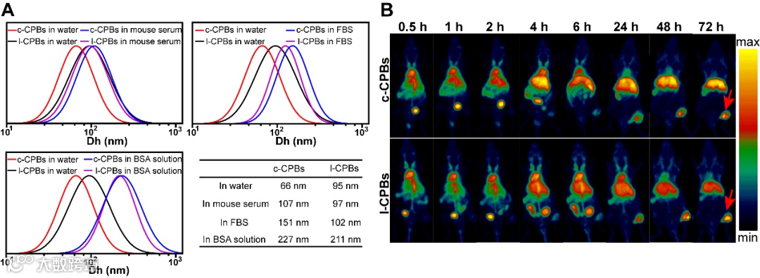 图三 (A)c-CPBs和l-CPBs在不同介质中的蛋白吸附行为 (B)c-CPBs和l-CPBs在H22荷瘤小鼠中的体内分布