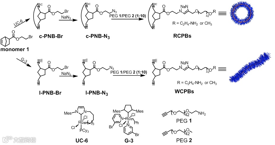 环形聚合物是一类环状无端基的高分子材料,具有多种不同于线形聚合物的物理化学性质。但目前已报导的环形聚合物大多具有较高的柔性,环形分子链呈高度卷曲的状态,因此它们所表现出来的性能并不能直接归因于环状的形貌结构。聚合物分子刷(cylindrical polymer brushes, CPBs)是一类高度接枝的具有刷形拓扑结构的高分子材料,其密集侧链之间的拥挤效应使主链呈伸展状态并具有一定的刚性,赋予CPBs独特的一维蠕虫状纳米结构。正是由于这种高密度的侧链,使得主链为环形的CPBs能够在各种介质中保持其环状形貌,其性能也与柔性的环形聚合物有显著不同。到目前为止研究环形CPBs的工作仍十分有限,其生物性能几乎一无所知。