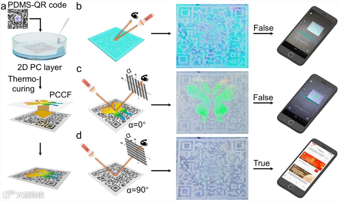 为了显示所提出的PCCF具有非凡的加密能力,研究团队演示了其用于信息编码、加密和防伪等领域的应用。特别是二维码,因其存储容量大、纠错能力强、成本低等显著优势,成为了世界上应用最广泛的编码系统,已被应用于制造业、商业活动、医疗保健等各个领域。然而,在某些情况下,公开二维码是不可取的。在这种情况下,PCCF材料可以为二维码提供加密功能。具体来说,当从入射光面观察时,顶层呈现出明亮的绿色结构颜色,掩盖了底层。因此,手机无法解密二维码,如图5b所示。此外,当从入射光的另一侧观察时,顶层显示了彩虹色的“蝴蝶”图案,遮挡了底层,这导致了错误图像(图5c)。最终,只有通过将偏振器旋转到特定的偏振角度(即α = 90°),智能手机才可以读取下方的二维码,如图5d所示。因此,二维码中的隐私信息几乎可以得到PCCF的完美保护,从而实现了信息的隐蔽存储和交换。