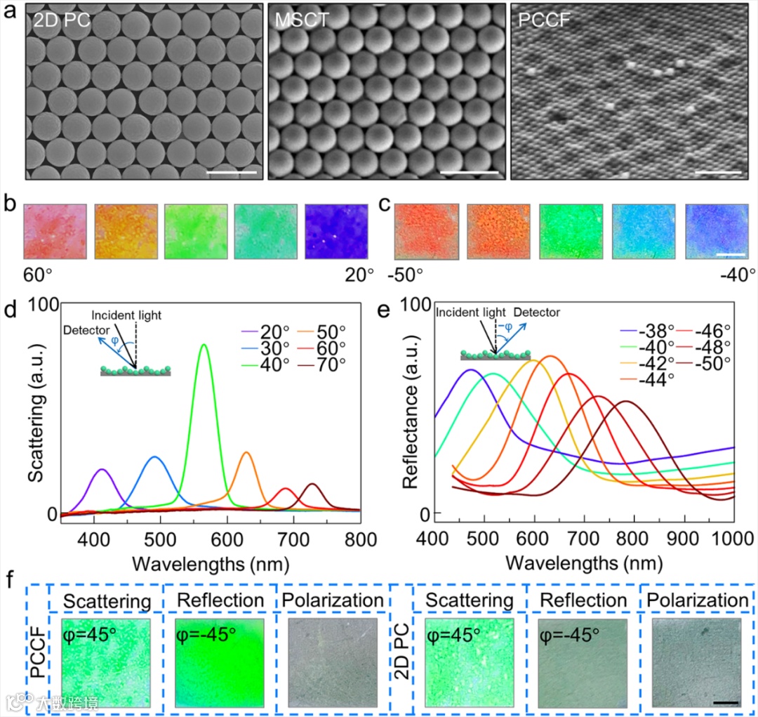 图3a分别展示了2D PC、MSCT和PCCF的单层有序紧密堆积的微观结构。结果表明,自组装的单分子层微球相互紧密堆积,呈二维六方晶格排列。图3b-e 分别展示了PCCF在不同视角下的光学图像及其对应的光谱。图f对比了2D PC和PCCF在观察不同条件下的光学图像,显示出了PCCF优异的光学性质。