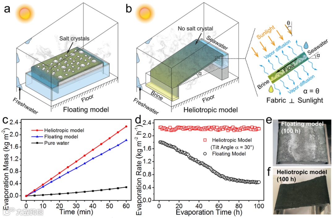 当阳光倾斜照射时,传统的漂浮蒸发装置光吸收面始终保持水平(图3a, α=0°),所能捕获的太阳光能量也随之越来越低(图3c),对太阳能海水蒸发极为不利。向光型蒸发装置的光吸收面可始终与太阳的入射方向保持正交(图3b, α=θ),维持投影面积不变(图3c),使得所捕获的太阳光能量保持稳定。在后续的蒸发测试中,当入射角θ从-90°逐渐调整至0°,再增加到90°时,漂浮型和平挂型装置(α=0°)均出现蒸发速率先升高再降低的变化(图3d),而向光型装置(α=θ)的蒸发速率始终维持在2.2-2.3 kg m-2 h-1之间,不随θ的变化而发生改变(图3d),有效解决阳光倾斜入射所导致的蒸发减弱的问题。