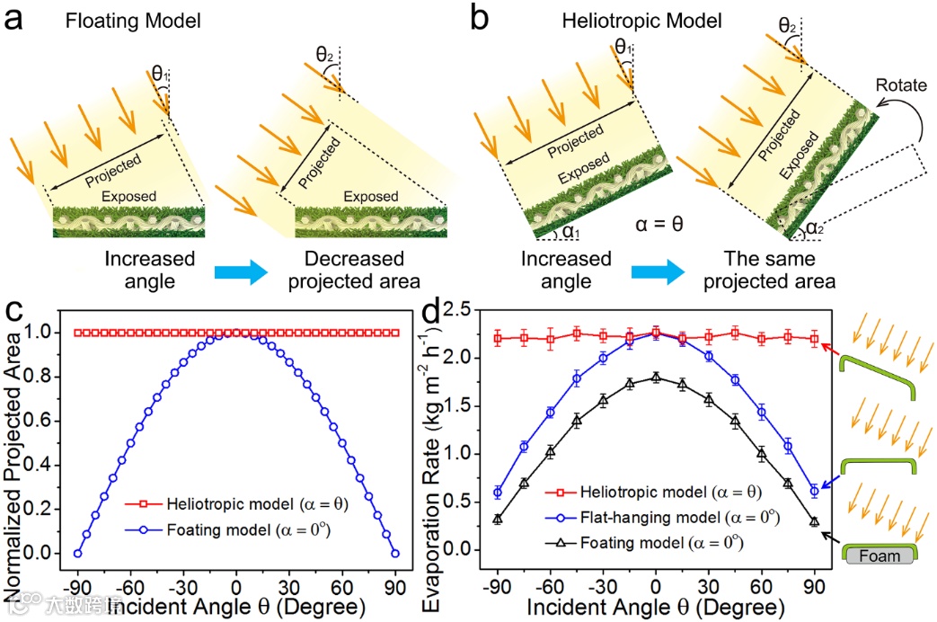 图3 阳光倾斜入射对不同蒸发模型投影面积的影响。不同入射角照射下漂浮型(a)和向光型(b)装置示意图;(c) 两种模型的归一化投影面积与入射角度在理论上的对应关系。(c) 漂浮、平挂和向光装置的蒸发速率与入射角的对应关系