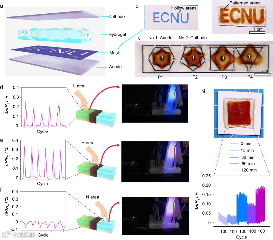 电化学功能化提供了一种高效且易于操作的方法来实现水凝胶的图案化修饰,并使不同模块对外部压力具有差异性的敏感,这赋予了水凝胶更复杂的传感系统。