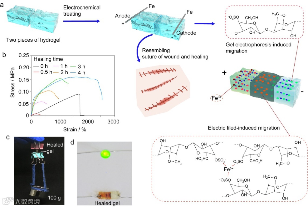 如图一所示,电化学功能化策略以聚丙烯酰胺(PAAm)/κ-卡拉胶水凝胶材料为基底,以铁丝为电极,通过对水凝胶施加不高于3伏特的电压,即可达到水凝胶多项功能的优化。κ-卡拉胶在水溶液下易电离,其分子链上带负电荷的硫酸酯基团赋予水凝胶优良的导电性能,这为实现电化学功能化提供了理论基础。在水凝胶的两端施加电压,阳极发生氧化反应,生成的Fe3+被引入水凝胶基质中,与κ-卡拉胶双螺旋结构外侧的硫酸酯基团形成离子交联网络结构。同时,Fe3+和阴极生成的OH-产生离子电泳,即阳离子向阴极移动,阴离子向阳极移动,在电泳的过程中生成的Fe(OH)3以氢键的形式连接κ-卡拉胶与PAAm网络,实现分子缠结。