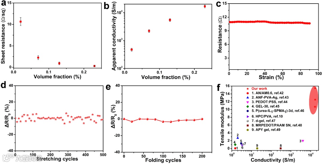 图3. (a) 和 (b) 具有 不同AgNWs含量的导电ANF-PVA/AgNWs水凝胶的方块电阻和表观电导率;(c) 具有AgNWs体积分数0.23%的ANF-PVA/AgNWs水凝胶拉伸应变-电阻值;(d) 拉伸应变设置在15%条件下,循环拉伸-恢复的电阻变化;(e) 折叠角度180°下的循环折叠-恢复的电阻变化;(f) 水凝胶拉伸强度和电导率的比较;(g) 拉伸、弯曲和扭曲条件下导电ANF-PVA/AgNWs水凝胶作为导体点亮LED灯泡的图片;(h) 杂化水凝胶拉伸前后通过导电网络的网状导电AgNWs网络和电子传输路径示意图