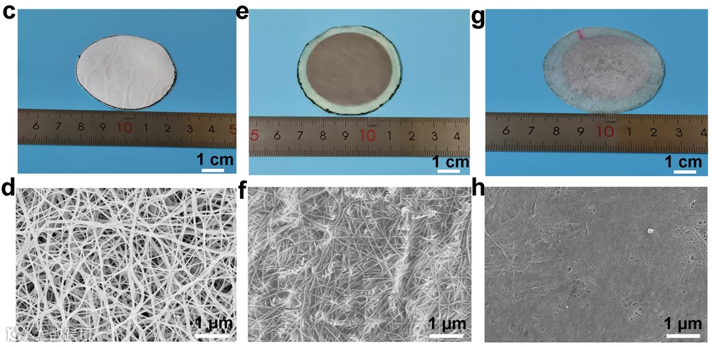 图1. (a) ANF 增强 PVA 水凝胶和具有三明治结构的导电杂化水凝胶的制造过程示意图。(b) ANF 增强 PVA 水凝胶中分子间相互作用的示意图。(c, d) 静电纺丝法制备的 ANF-PVA 纤维毡的图片和 SEM 显微图片; (e, f) 通过在 ANF-PVA 纤维毡上真空辅助过滤 AgNWs/PVA 制备的导电杂化水凝胶;(g, h) 三明治结构的导电水凝胶