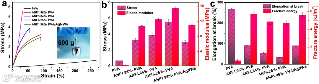 图2. (a) 拉伸应力-应变曲线;(b) 拉伸强度,弹性模量;(c) 具有不同 ANF 含量的 ANF 增强 PVA 水凝胶以及具有 0.23 vol% AgNWs 的三明治结构 ANF1.96%-PVA/AgNWs 复合水凝胶的断裂伸长率和断裂能