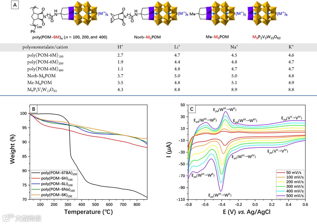 图2. (A) 不同类型POM分子在水溶液中的外围阳离子电离数,(B) poly(POM)100的TGA曲线,(C) poly(POM-6H)100的CV曲线。