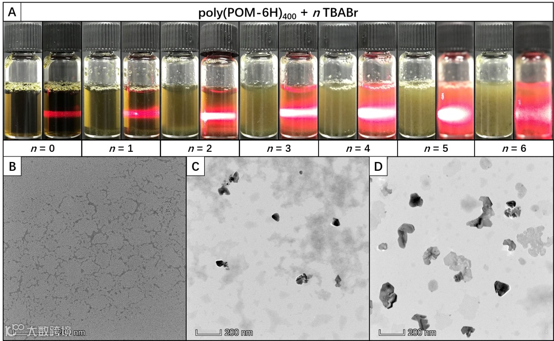 图3. 向poly(POM-6H)400水溶液中加入TBA生成沉淀的 (A) Tyndall效应及其光学照片;(B−D) TEM图像(B: n = 0, C: n = 3, D: n = 6)。
