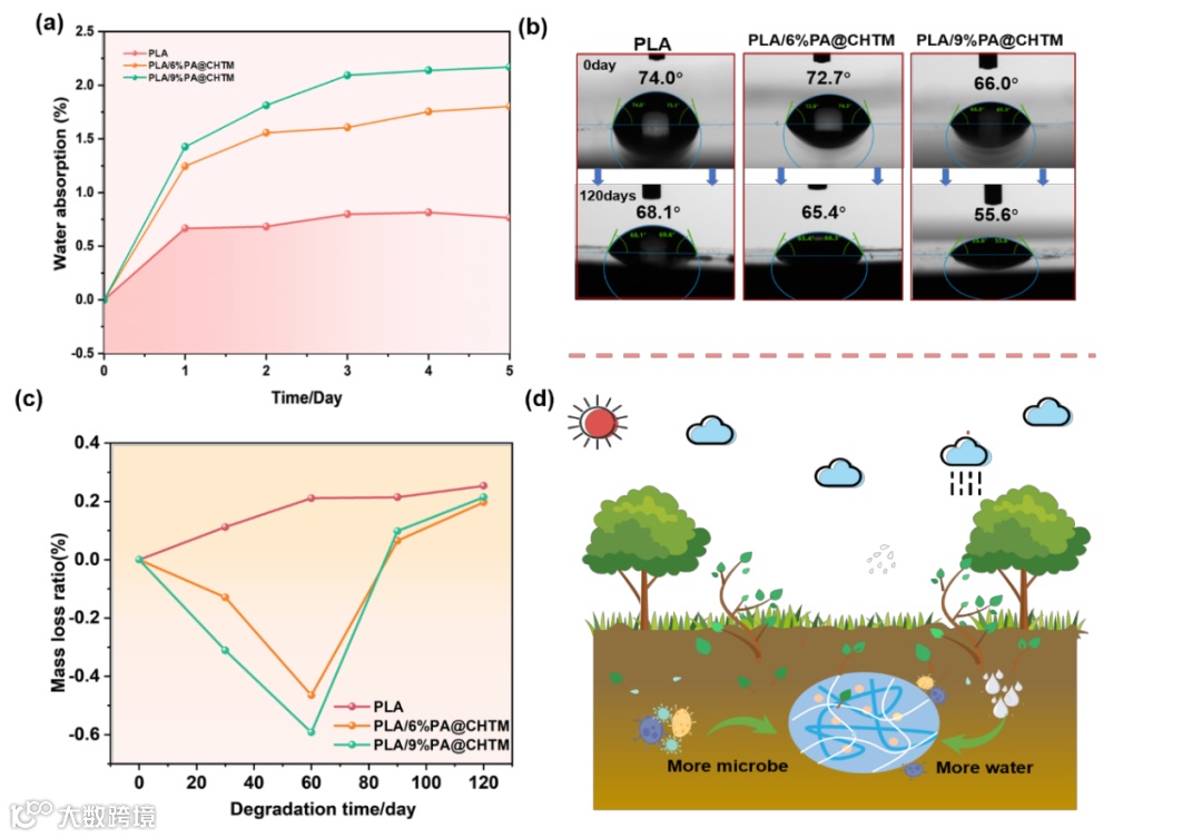 Figure 5. The water absorption rate of PLA and PLA composites for different times (a); water contact angle of PLA and PLA/9%PA@CHTM film after 0 days and 120 days degradation(b); mass retention rate of PLA and PLA composites for different times (c); possible degradation mechanism of PLA/9%PA@CHTM in soil (d)