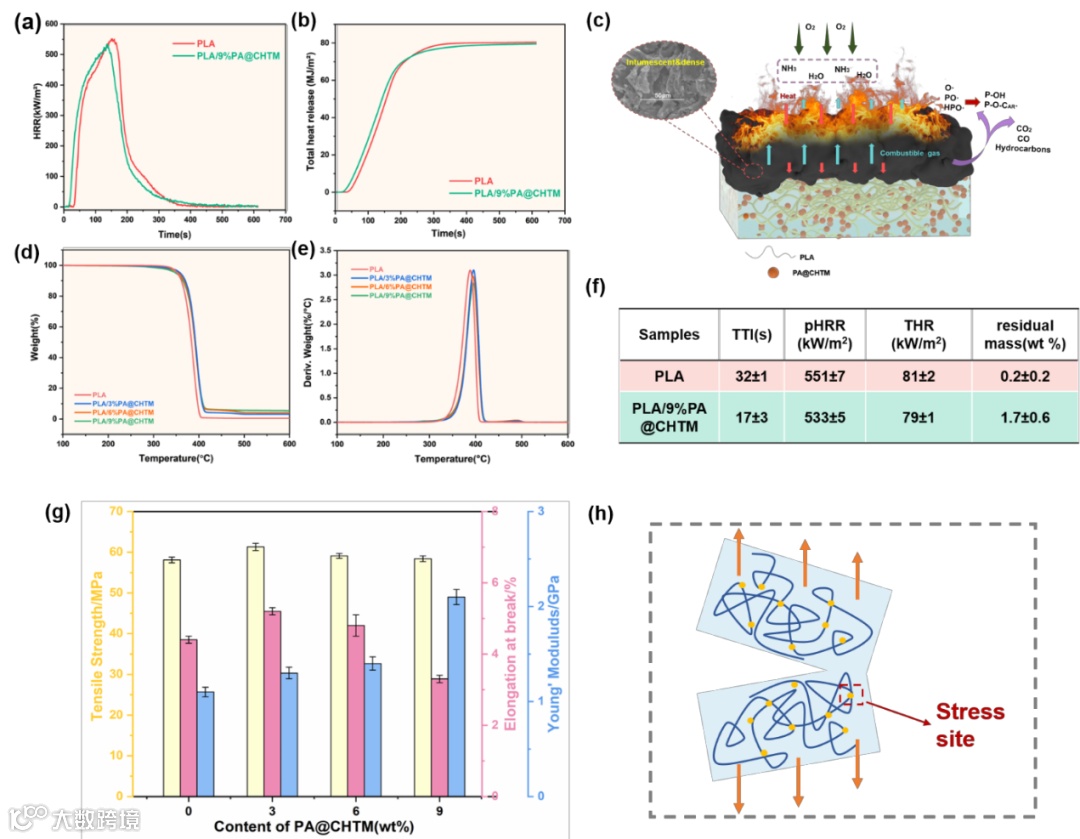 Figure 2. HRR (a), THR (b) curves of PLA and PLA composites; possible flame retardancy mechanism of PLA/9%PA@CHTM (c); TG (d) and DTG (e) curves of PLA and its flame-retardant composites in N2 flow; Key data of CONE tests for PLA samples(f); mechanical properties of PLA and its composite materials(g,h)