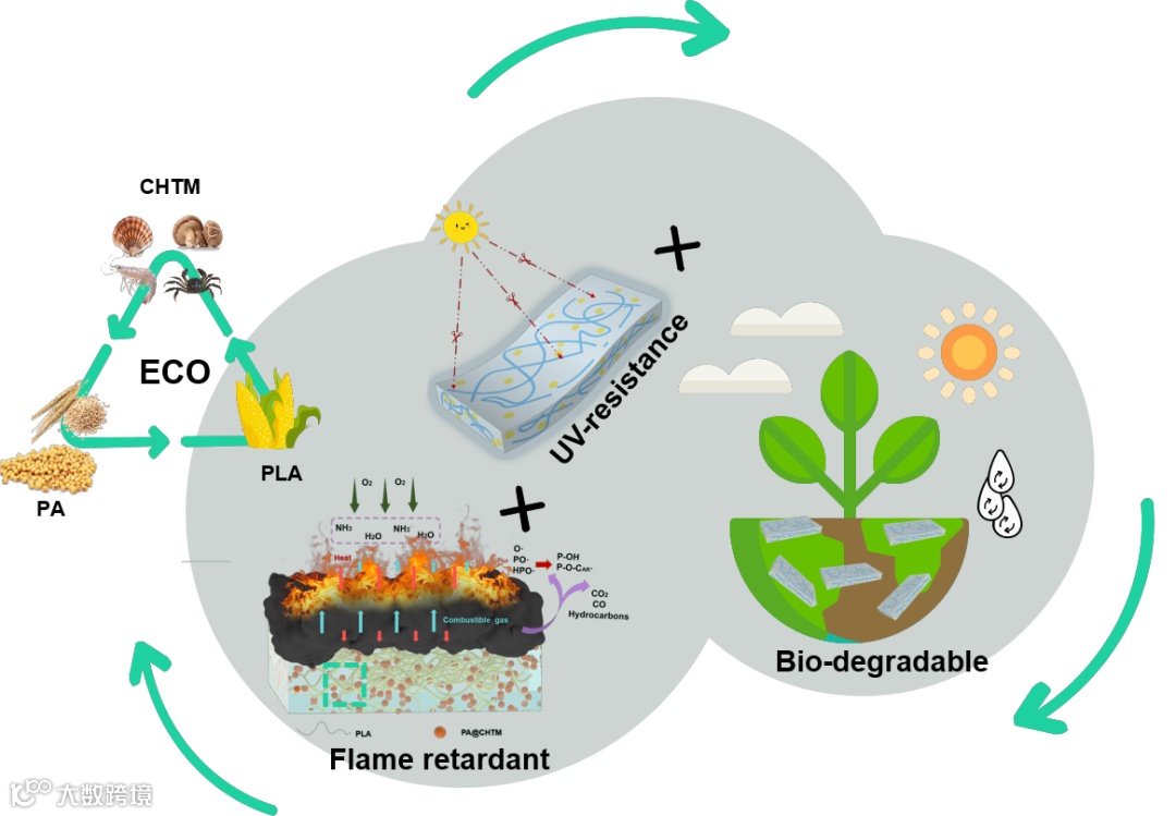 近日,北京化工大学张胜教授课题组在Chemical Engineering Journal上发表了题为“A new strategy to prepare fully bio-based poly(lactic acid) composite with high flame retardancy, UV resistance, and rapid degradation in soil”的研究论文,以壳聚糖和植酸为原料通过简单的自组装反应,合成了一种全生物基助剂,并引入到聚乳酸中,制备了可完全生物降解的聚乳酸复合材料,该复合材料同时能实现阻燃,高强度,耐紫外等多种功能,并且可实现在土壤中快降解。该研究为聚乳酸多功能利用以及可自然降解提供了新方向。