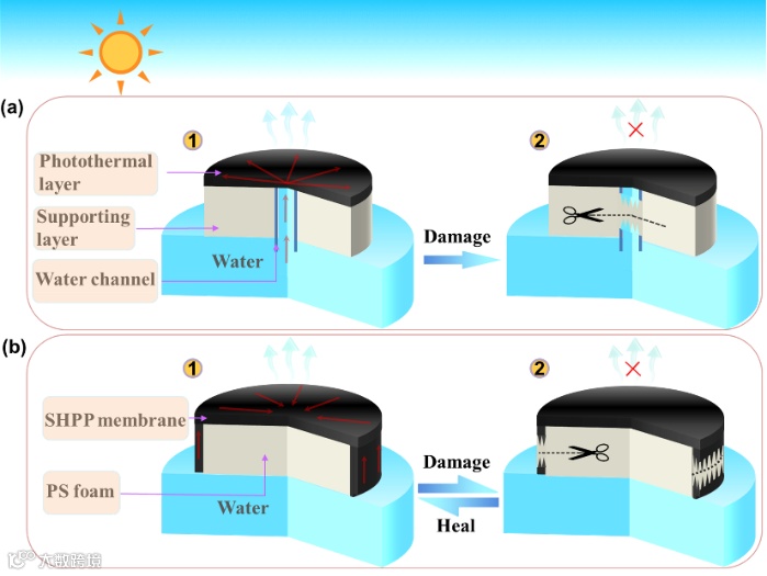 图1. (a) (1)太阳能驱动界面蒸发器的组成;(2)由于水传输通道损坏而丧失其水蒸发能力。(b) (1) SHPP膜太阳能驱动界面蒸发器的组成和(2)物理损伤后通过自修复恢复光热水分蒸发能力的示意图。