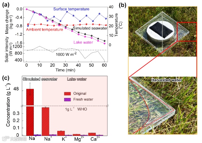 图3. (a) 太阳强度、环境温度、模拟海水和湖水质量以及PU20/CB0.5/NaCl5膜蒸发器表面温度随自然光照的变化(吉林大学;2021年7月23日;12:30-13:30)。(b)PU20/CB0.5/NaCl5膜蒸馏装置图。(c)利用PU20/CB0.5/NaCl5膜进行光热水蒸发纯化前后模拟海水和湖水中钠,钾,镁和钙离子的浓度。