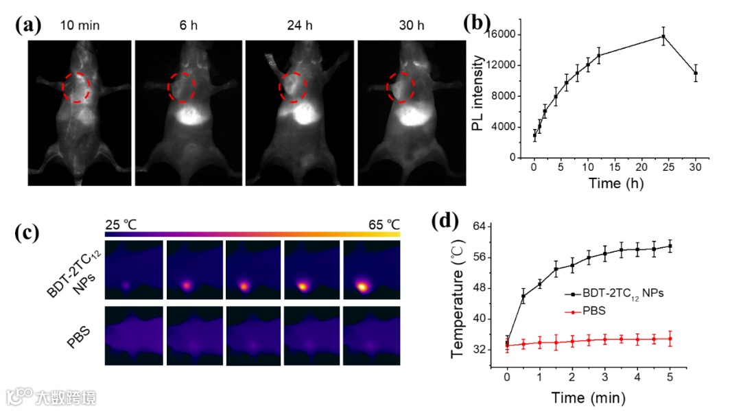 近红外二区(NIR-II,1000-1700 nm)荧光成像技术相对于传统的600-900 nm范围的近红外荧光成像,因减小了生物组织的光散射和吸收,具有厘米级的成像深度、低的背景噪音、优异的成像信噪比和高分辨率,在肿瘤等疾病的成像方面引起了广泛的关注。同时,基于1064 nm波长激光的NIR-II光热治疗相比于近红外一区光热治疗对生命组织具有更优的穿透深度和更高的生物安全使用功率(1.0 W cm-2),能够显著增强光热效率和治疗效果,并能减小对生命组织的伤害。有机共轭聚合物由于具有出色的光学特性、良好的生物相容性和分子结构易于调控的特点,在荧光成像和光热治疗领域都表现出巨大的潜力。特别是灵活可调的光学特性使得共轭聚合物也被开发用于NIR-Ⅱ荧光成像和1064 nm激光激发的NIR-Ⅱ光热治疗。然而,现有报道的NIR-Ⅱ荧光成像共轭聚合物的溶解性和荧光强度均不太令人满意,造成成像质量不理想。更为重要的是同时具备NIR-Ⅱ荧光和NIR-Ⅱ光热的共轭聚合物报道的还较少。因此,迫切需要开发一种简单高效的方法提高共轭聚合物的溶解性,NIR-Ⅱ荧光的亮度,最终实现NIR-Ⅱ荧光成像指导的NIR-Ⅱ光热治疗。
