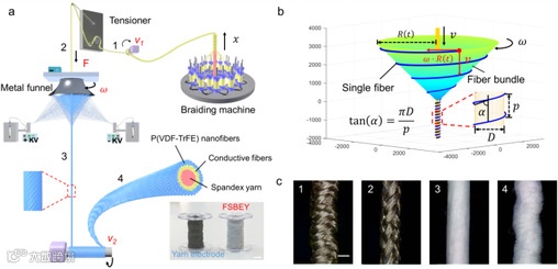图1(a)费马螺旋摩擦电纱线的连续化纺织流程;(b)费马螺旋纳米纤维结构的模型;(c)纱线电极和摩擦电纱线在不同制备阶段的实物照片