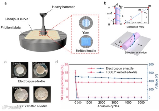 图2 费马螺旋摩擦电纺织品的超高耐磨性。(a)标准马丁代尔测试示意图;(b)费马螺旋摩擦电纱线滑动时受力分析图;(c, d)传统静电纺丝薄膜和新型纳米纱线织物的耐磨性对比。