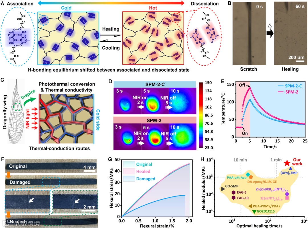 随着温度的升高,可修复聚合物基体中的UPy氢键逐渐由结合状态转移到离解状态;上述加热的变化过程可以暂时性地降低了组装体的分子量和模量,导致聚合物链的流动性增强;聚合物链的快速流动性有助于聚合物的修复过程,故初始的可修复材料具有不错的加热修复的能力。仿生复合材料中的MXene三维互联骨架具有良好的光热转换能力和良好的热传导能力,其可将近红外光转变为热量,同时三维互联的骨架有助于热量的快速传递,故仿生复合材料能够实现远程、快速、高精度地原位光控修复过程。修复实验证实,仿生复合材料样品在近红外光照射30s后就能修复表面划痕及自身机械性能。