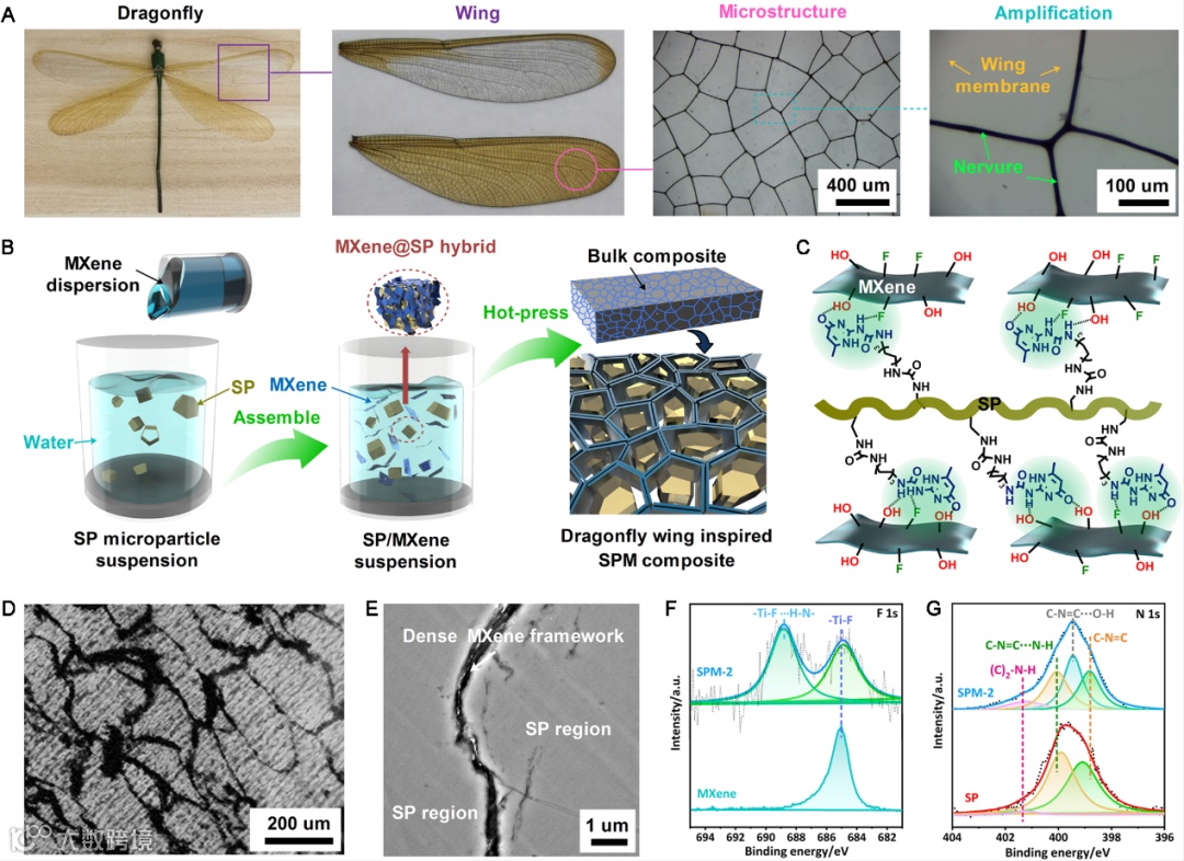 作者受到蜻蜓翅膀微结构的启发,首先将MXene纳米片包覆在刚性可修复的聚合物材料表面,而后通过热压定构加工的方式制备了仿生复合材料。光学显微镜和透射显微镜证明了复合材料内部的仿生微结构—形成了三维互联的MXene骨架;XPS证明MXene骨架和聚合物直接存在强大的界面氢键相互作用,这也有助于提升复合材料整体的机械性能。