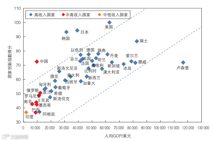 “值得关注的是,中国创新能力稳步上升,大幅超越处于同一经济发展水平的国家。”刘冬梅指出,2018年中国人均GDP为9771美元,在世界40个主要国家中仅高于印度、南非、巴西、土耳其和墨西哥。但是,中国创新指数得分已接近人均GDP在5万美元左右的欧洲国家,是唯一一个R&D投入强度超过2%的中高收入阶段国家。