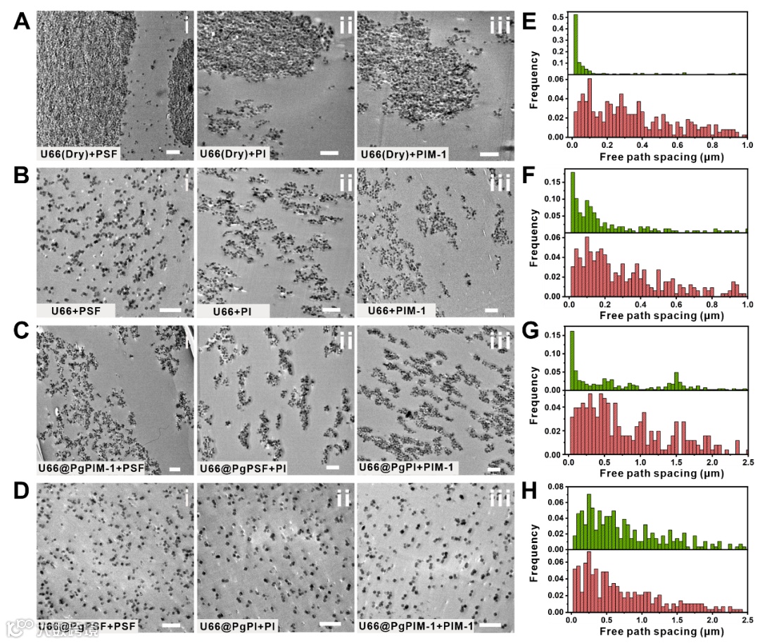 最后,作者进一步利用超薄切片结合透射电镜(TEM)表征的方法比较了表面未修饰高分子、表面修饰了不匹配高分子以及表面修饰匹配高分子的MOF颗粒在高分子基质中的分散度。结果表明当MOF表面修饰的高分子与基质相同时,颗粒在膜中的分散度相比其他对照组非但显著提升,而且与Monte Carlo模拟的无聚集倾向的样品结果高度吻合,由此进一步验证了“相似相溶”策略的优越性。