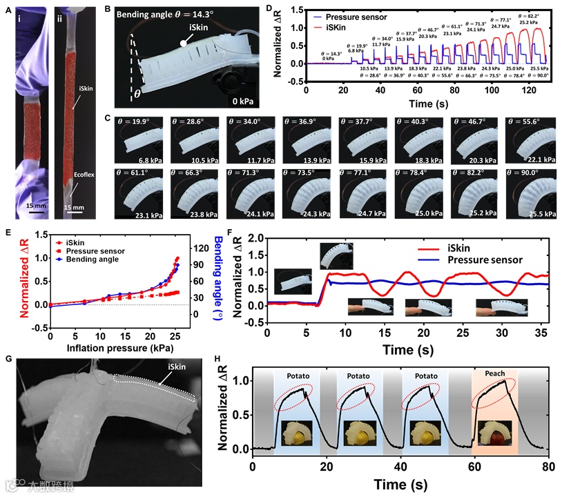 图3. iSkin用于软体机械手的感知。