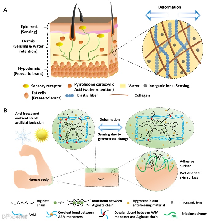 自然界中,哺乳类动物,鱼类,蛙类,昆虫类以及细菌类等生物经过了几万年的演化形成了一套特殊的生理结构,其展现的抗冻,抗干燥,自适应等特征能够保障他们在复杂多变和极端环境下生存。而对于人类,皮肤作为人体最大的器官通常充当人体内部物理,温度和湿度保护屏障,并控制着身体与外界的水分交换。同时皮肤中包含大量的神经感知单元可以用来感受诸如压力,形变,温度,湿度和疼痛等来自外部环境的刺激。皮肤的这些功能是通过其内部相应的复杂结构来实现的。例如,其高度抗形变的胶原蛋白和弹性纤维网络用于承受物理变形;保湿物质如吡咯烷酮羧酸(pyrrolidone carboxylic acid) 用于锁水;皮下脂肪细胞用于抵御寒冷;多种感知神经元如力学感受器,温觉感受器及疼痛感受器,可将外部刺激转化成钾钠离子的移动和动作电位在神经细胞中的传递。皮肤的这些结构特征为我们设计新型可拉伸电子带来了启发。通过精巧地设计并组合相关电子元器件及弹性体材料,研究人员已成功开发出诸如电子皮肤(electronic skin)等仿人体皮肤的电子设备,并在可穿戴电子,可穿戴康复机械人和软体机器人等领域展现了巨大的应用前景。值得注意的,由于仿生皮肤和软体机器人之间优异的机械性能匹配和功能互补,目前已有大量研究精力投入到开发适合集成到软体机器人的可拉伸和可穿戴仿生电子皮肤,从而确保更安全,更智能的人机互动和环境适应性。