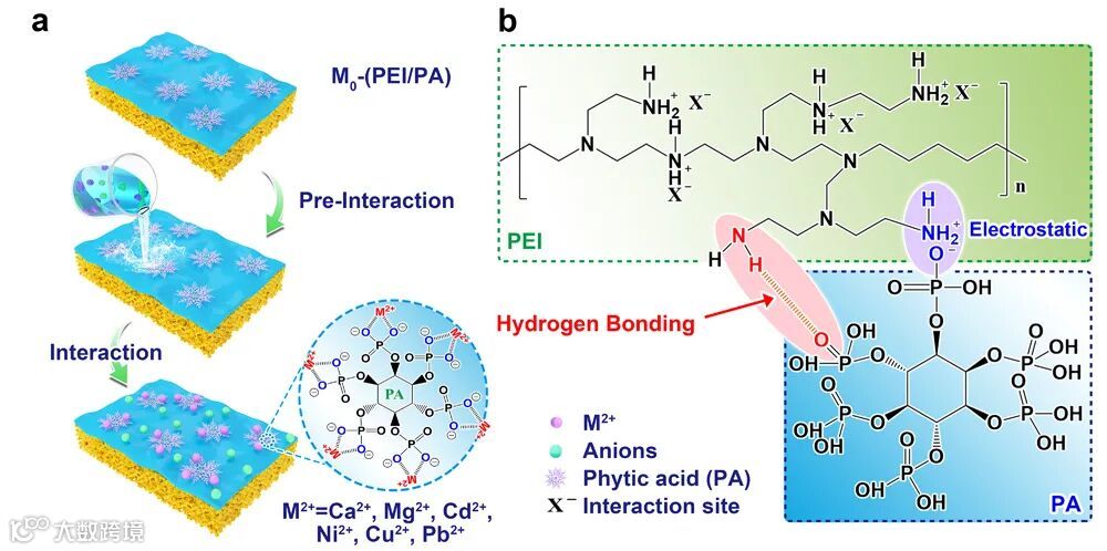 作者最后提出M0-(PEI/PA) 膜对重金属离子高去除率可能的机理分析(图6)。在传统聚哌嗪酰胺纳滤膜表面通过聚乙烯亚胺(PEI)和PA的层层组装策略,引入富含磷酸根的植酸分子。PEI和PA之间除了正负电荷的静电作用之外,还存在N-H···O氢键作用,这可使得PA分子牢固地附着在复合膜表面。引入植酸后的聚哌嗪酰胺膜会和废水中的二价金属离子M2+快速地发生络合行为,形成牢固的O--M2+-O-键,从而将水中的金属离子捕获。因此,M0-(PEI/PA) 膜对水中重金属离子去除,除了尺寸筛分和道南效应外,还有M2+-PO43-、M2+-NH2 (PEI) 的络合效应。