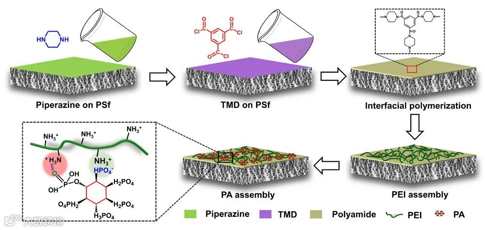 图1 植酸嵌入聚哌嗪酰胺复合纳滤膜的制备过程示意图