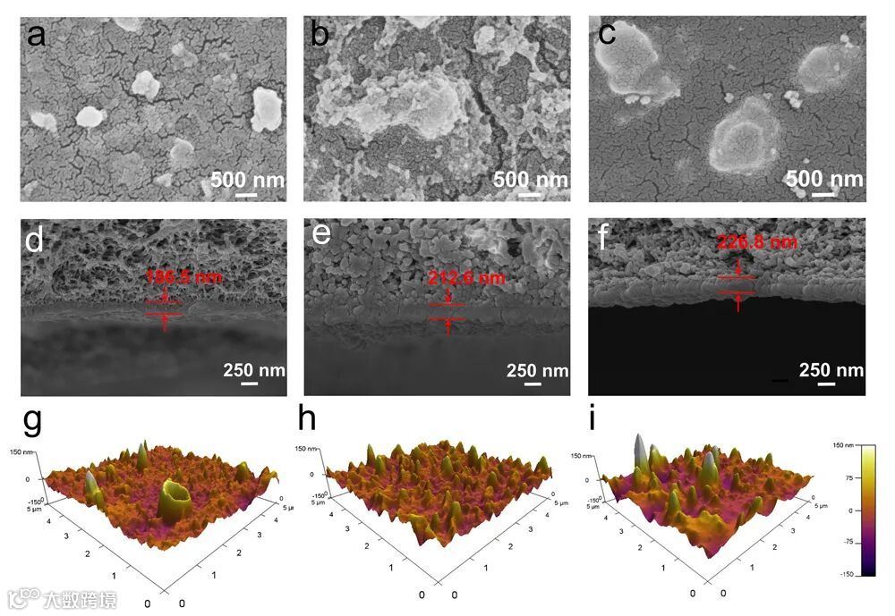 图5 M0、M0-(PEI/PA)1 和 M0-(PEI/PA)2 膜的SEM表面(a-c)、截面SEM (d-f)、AFM 高度图像(g-i)