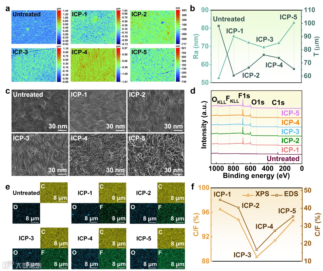 未处理温室薄膜和不同参数ICP处理温室薄膜的表面粗糙度(a)、表面粗糙度和薄膜厚度变化(b)、SEM表征(c)、XPS表征(d)、EDS表征(e)、XPS和EDS表征下C/F比变化(f)。