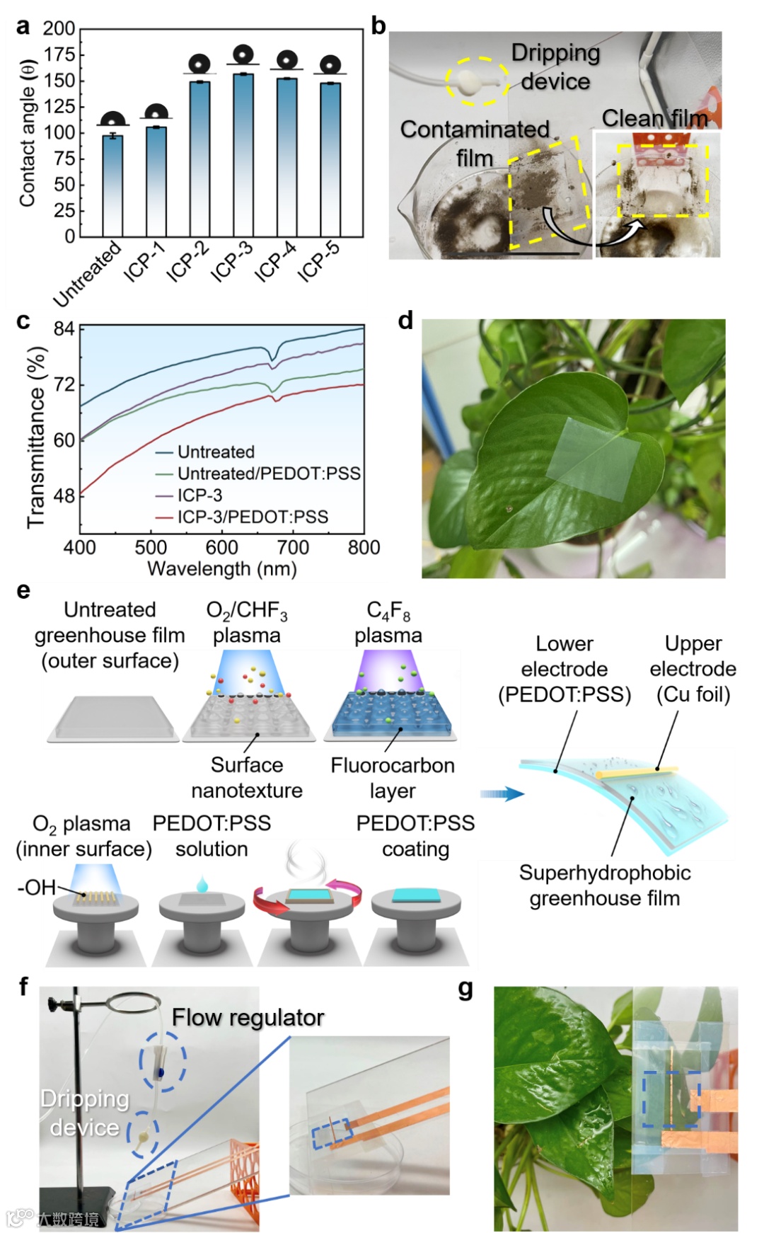 (a)未处理温室薄膜和不同参数ICP处理温室薄膜的水滴静态接触角。(b)超疏水改性温室薄膜的自清洁性能表征。(c)未处理和超疏水改性温室薄膜的透明度。(d)旋涂透明电极的超疏水改性温室薄膜。(e)RDE-TENG的制备流程。(f)用于雨滴能收集的RDE-TENG工作装置图。(g)RDE-TENG平面图。