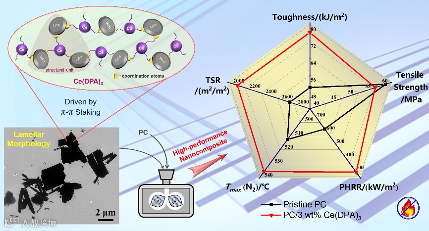 聚碳酸酯(PC)综合性能优良,用量居“五大工程塑料”之首。近年来,由于5G通信、人工智能等新技术的崛起,PC逐渐在电子设备、无人驾驶、通信基站、智能家居、建筑采光等领域崭露头角。但PC对缺口冲击敏感,且阻燃等级不足,由此易引发火灾、热失效和机械失效,限制了PC产品的适用场景。传统策略通常以牺牲综合性能为代价来降低火灾隐患,制备阻燃、耐热、强韧、透明的PC复合材料仍是一项挑战。
