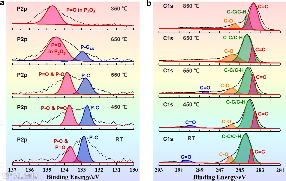 图3. PC/Ce(DPA)3-3复合材料在热分解过程中凝聚相产物的变温XPS光谱:(a) P 2p、(b) C 1s