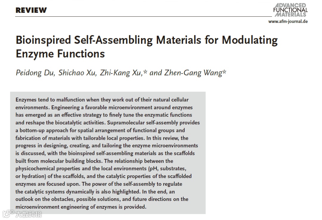 近日,北京化工大学王振刚教授团队与浙江大学徐志康教授合作,总结了近年来利用超分子自组装策略调控酶功能的相关研究进展,以“Bioinspired Self-Assembling Materials for Modulating Enzyme Functions”为题在《Advanced Functional Materials》发表综述。