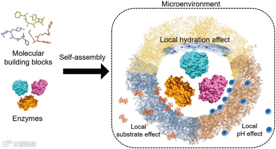 大多数的酶都具有pH高度敏感性。pH值的变化影响酶蛋白上氨基酸残基所带电荷情况,从而影响链之间的相互作用、蛋白质的折叠状态和活性位点的形状。当酶在天然细胞外进行催化反应时,体系的pH值往往偏离酶的最优值,不利于表现其最佳的催化活性。自组装材料,如DNA和多肽,能够通过带电结构单元的规整排布与聚集实现微环境的控制。DNA分子上骨架具有带负电的磷酸基团,在骨架表面通过静电相互作用吸引并富集质子,使靠近DNA的酶处于一个相对于体系而言更加酸性的微环境。多肽自组装能够通过酸性或碱性氨基酸残基聚集来为酶创造局部阳离子或阴离子环境,从而影响增强酶的活性。