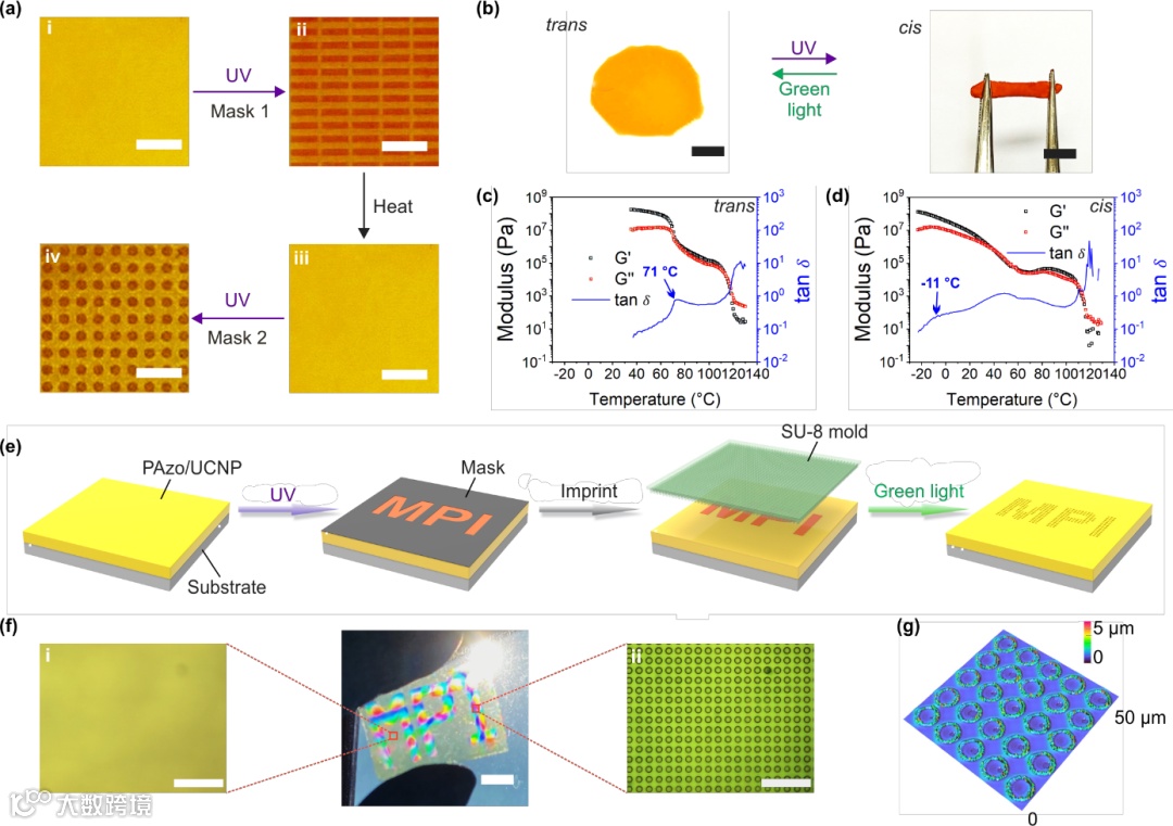 图2. (a) 可擦除和重写的光致变色图案。(b) 顺式和反式纳米复合材料的照片。(c) 反式纳米复合材料的流变数据。(d) 顺式纳米复合材料的流变数据。(e) 压印过程示意图。(f) 压印所得的结构色图案的宏观和光学显微镜照片。(g) 压印的周期性结构的共聚焦显微镜的照片。Adapted under the terms and conditions of CC-BY (Adv. Funct. Mater. 2021, 2103908).