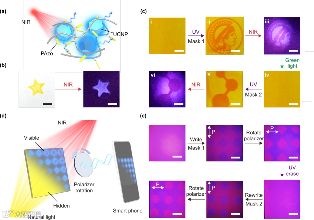 由于该纳米复合材料里的上转换纳米粒子可以将近红外光转变为可见光。作者们利用这一性质制备了不同的上转换发光图案 (图4)。纳米复合材料的溶液可以作为发光墨水印出上转换发光的防伪图案。由于顺式偶氮聚合物可以吸收上转换的蓝光,所以根据偶氮聚合物和上转换纳米粒子的协同作用,可以利用近红外光对光致变色图案进行识别。如果在摄像头前加一个偏振片,通过旋转偏振片角度还可以识别出偏振相关的上转换发光图案。