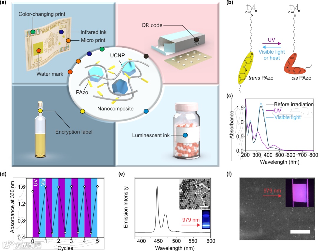 图1. (a) 由PAzo和UCNPs组成的防伪纳米复合材料应用在不同产品的示意图。(b) PAzo的化学结构和光致异构化。(c) PAzo薄膜的紫外可见吸收光谱。(d) PAzo薄膜在交替的紫外和可见光照射下吸光度的变化。(e) β-相 NaYF4:TmYb@NaYF4(核 = NaYF4:0.5 mol% Tm3+:30 mol% Yb3+;壳 = NaYF4)的上转换发光光谱。插图:UCNPs 的 TEM 图像和 979 nm 激光照射下UCNPs分散液的照片。(f) PAzo/UCNPs 纳米复合材料的 SEM 图像。插图:纳米复合材料薄膜在 979 nm 激光照射下的照片。Adapted under the terms and conditions of CC-BY (Adv. Funct. Mater. 2021, 2103908).