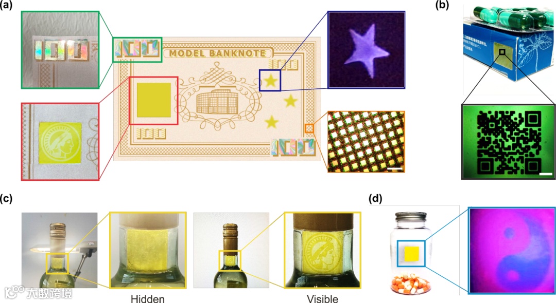图5. (a) 将纳米复合材料应用在纸币模型上。(b) 将纳米复合材料应用在药盒上。(c) 将纳米复合材料应用在酒瓶上。(d) 将纳米复合材料应用在药瓶上。Adapted under the terms and conditions of CC-BY (Adv. Funct. Mater. 2021, 2103908).