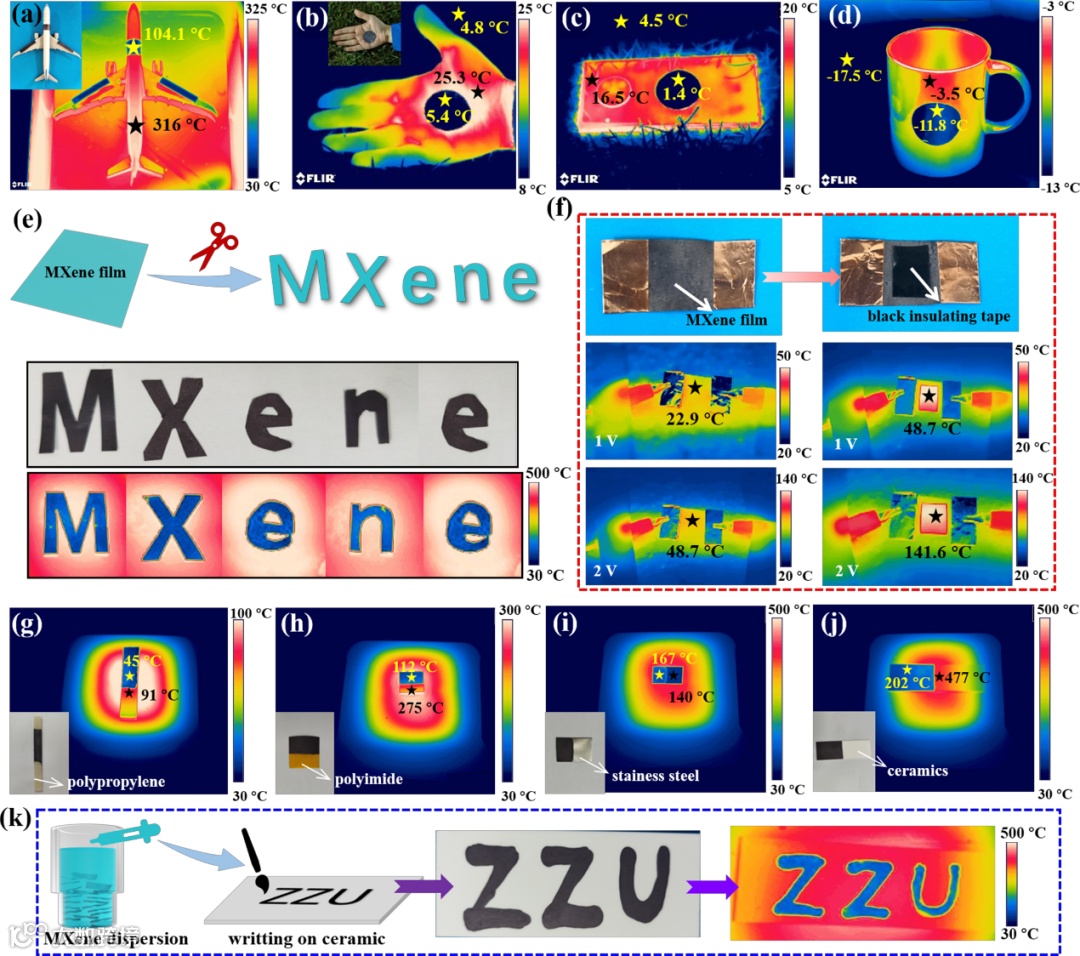 MXene薄膜在较宽温度范围内(-10 ℃到500 ℃)都具有很好的热伪装效果。此外,由于MXene薄膜具有良好的柔韧性,将其裁剪成字母状的“MXene”并放在高温物体上,“MXene”字母可以在红外相机中清晰地显示出来。同时,MXene分散液也可作为可印刷的热伪装墨水直接涂抹在聚合物、金属、陶瓷板等基底上,并表现出优异的高温热伪装性能。在陶瓷板书写上字母“ZZU”,随后将陶瓷片放在高温目标上(508 ℃)时,“ZZU”同样在红外相机中清晰地显示出来,展现了MXene在红外信号传递方面的巨大应用潜力。此外, MXene薄膜的高导电性使其展现出优异的可热伪装的电加热性能,在军事领域具有极大的应用潜力。