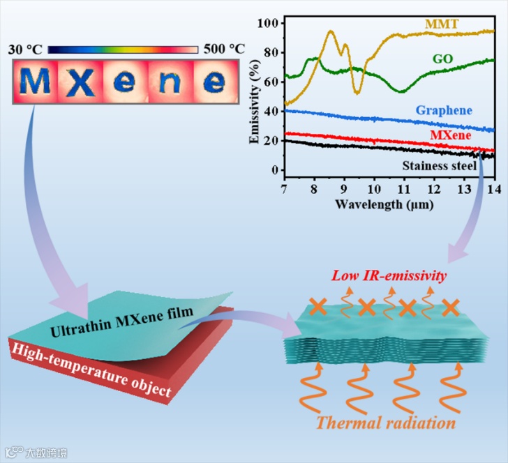 近日,郑州大学材料学院王建峰副教授和王万杰教授团队率先报道了Ti3C2Tx MXene的红外低发射特性(7~14 μm波段范围内发射率为0.19),与不锈钢薄膜相当,远低于石墨烯、氧化石墨烯以及纳米蒙脱土等二维材料。在较宽的温度范围内(-10 ℃到500 ℃),1 μm厚的超薄柔性MXene薄膜以及超薄MXene涂层展现出优异的、长时间稳定的室内/室外热伪装性能,能使500℃高温物体的辐射温度降低300℃以上,优于已报道的热伪装薄膜/涂层材料。同时,MXene薄膜/涂层具有优异的可热伪装的电加热和高效的电磁波屏蔽性能。该论文为基于超薄薄膜/涂层材料实现高温物体的热伪装提供了有效策略,展示了MXene材料在热伪装、红外隐身、辐射加热、红外信号传输、安全防护等领域的巨大应用潜力。该研究以“Ultrathin Titanium Carbide (MXene) Films for High-Temperature Thermal Camouflage” 为题发表在最新一期的《Advanced Functional Materials》上(DOI:10.1002/adfm.202101381)。