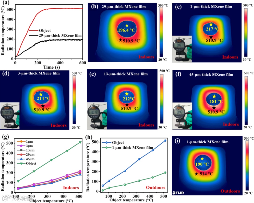将MXene薄膜放置在不同温度的物体上,当目标物体辐射温度为510.9 ℃时,29 μm厚MXene薄膜的表面辐射温度为196.4 ℃,将目标物体的辐射温度降低了314.5 ℃。此外,随着MXene薄膜厚度的减小,放置在同一高温目标物体上的MXene薄膜的辐射温度逐渐升高。但即便厚度低至1 μm时,MXene薄膜依然表现出优异的热伪装性能,可以将高温目标物体(510.9 ℃)的辐射温度降低近300 ℃。同时,在室外环境(9 ℃)中,MXene薄膜的热伪装性能要优于其室内环境中的热伪装性能,当目标物体的辐射温度分别为514 ℃,29 μm厚的MXene薄膜的辐射温度为170.3 ℃。