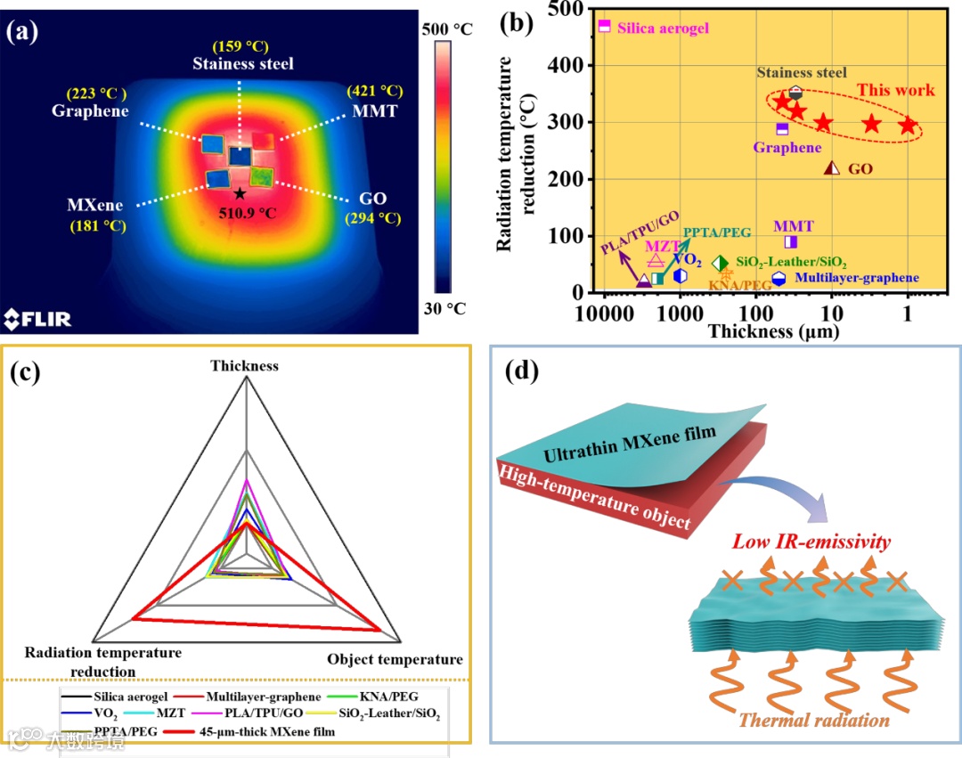 图5. MXene薄膜热伪装性能与其他材料对比