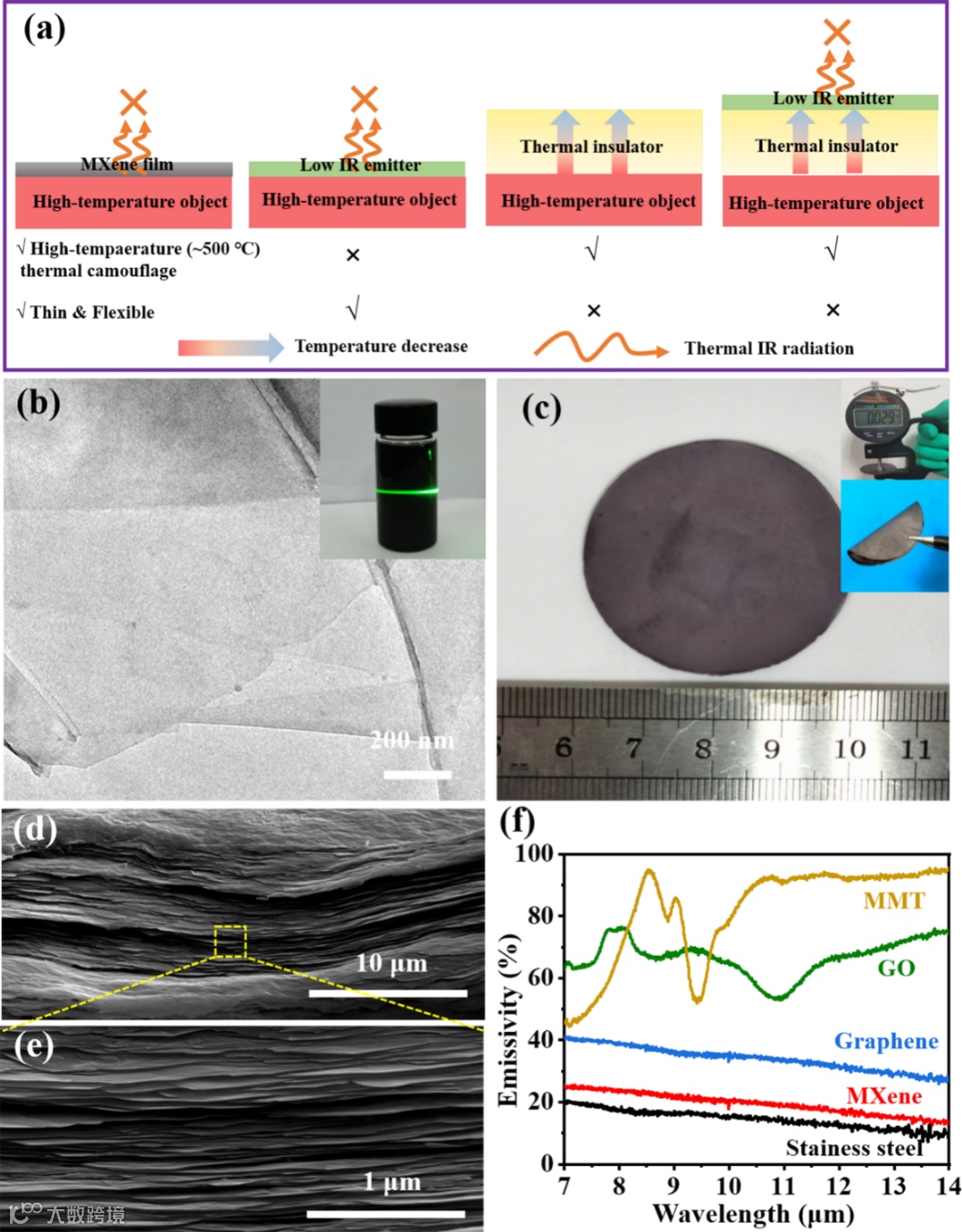 图2.(a)热伪装原理示意图;(b)MXene纳米片的TEM图;(c)MXene薄膜的电子照片;(d,e)MXene薄膜断面的SEM图;(f)MXene等不同材料的红外发射率