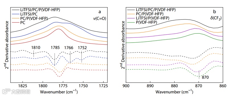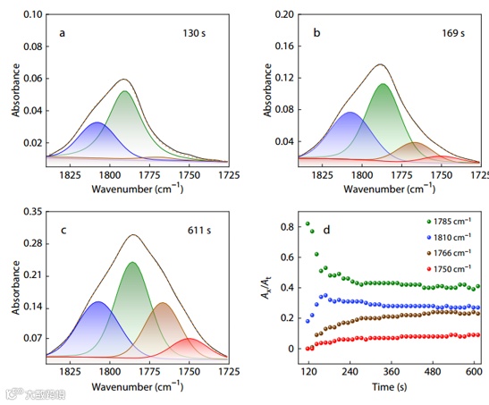 图4 PC-LiTFSI在P(VDF-HFP)扩散过程中(a) 130 s,(b) 169 s,(c) 611 s时的高斯拟合曲线;(d)不同状态C=O在扩散过程的比例变化情况