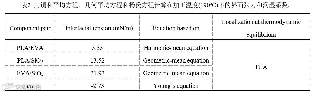 由于EVA的熔点远低于PLA的熔点,EVA相先熔化,因此SiO2初始分布在EVA相中。而根据润湿系数的计算发现SiO2的热力学平衡位置是在PLA相中(表1、表2)。所以在加工过程中,SiO2会从EVA向PLA相迁移。TGA结果证明比表面积越高的SiO2的吸附分子链能力越强(图2),因此,其填充的EVA相的粘度越高(图3,其中,在EVA中SiO2的含量在二元EVA/25SiO2与三元85PLA/15EVA/5SiO2是保持一致的),SiO2迁移速度也越慢,故更难迁移到界面处。