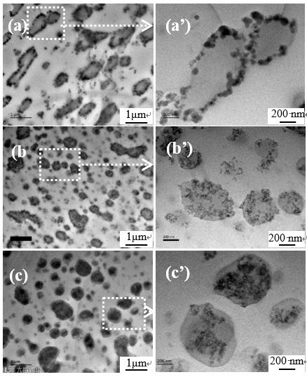 图1 含有5 wt%不同比表面积SiO2: (a, a’) A50, (b, b’) A200 and (c, c’) A380的85PLA/15EVA共混物的透射电镜图