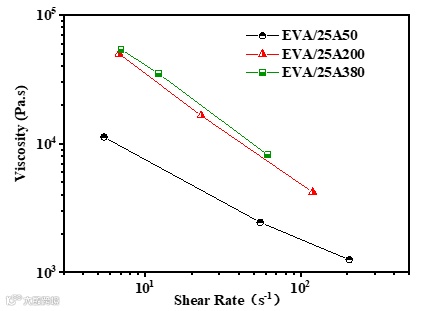 图3 EVA/25A50、EVA/25A200和EVA/25A380纳米复合材料的熔体粘度随剪切速率的变化