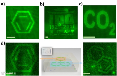 通过双光子聚合可在薄膜内产生的不同图案,例如“苯”结构和“厦门大学成立一百周年”的徽标等。与溶液中光刻相比,由于多孔材料的支撑与限制作用,不仅可以提高打印的分辨率,在薄膜内部还可以实现多层打印。
